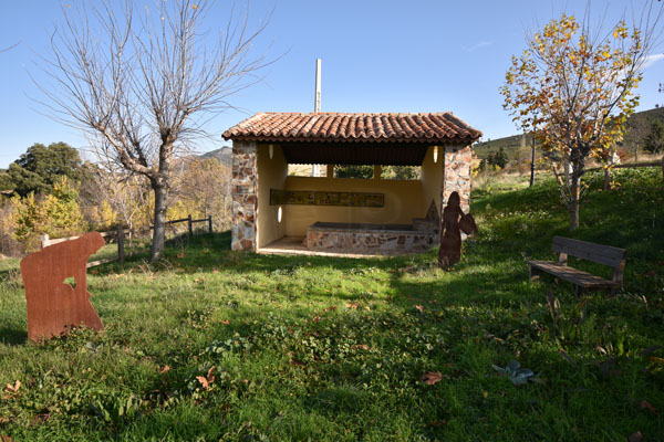 . Continuamos subiendo unas escaleras para llegar a un área recreativa con bancos y mesas donde se encuentra una construcción a modo de refugio levantado con mampostería con cubierta a un agua con tejas rojas, abierto por tres lados y con una columna en el centro igualmente de mampostería